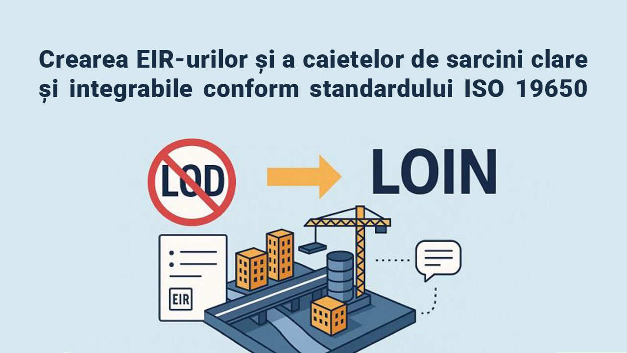 - Înlocuiți LOD cu LOIN. Cerințele din caietele de sarcini și EIR-uri trebuie formulate conform standardelor SR EN ISO 19650 și SR EN ISO 7817, care descriu clar informațiile necesare și scopul lor.